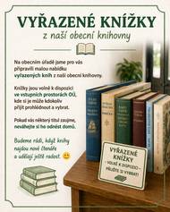 Na obecním úřadě jsme připravili nabídku vyřazených knih z naší obecní knihovny. Knížky jsou volně k dispozici ve vstupních prostorách OÚ, kde si je může kdokoliv prohlédnout a vybrat.
