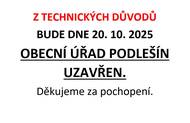 Dne 20. 10. 2025 bude OÚ Podlešín z technických důvodů uzavře