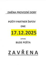 Pošta Partner Šafov bude ve středu dne 17.12.2025 zavřena.