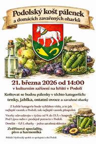 Myslivecký spolek ve spolupráci s OÚ zve 21. března od 14.00 hodin v klubovně na hřišti na 1. Podolský košt slivovice a domácích zavařených oharků. Vzorky můžete odevzdávat od 9. do 15. března v prodejně smíšeného zboží nebo v hostinci Pod Lípou. Vzorek destilátu je 0,5 l a vzorek oharků je jedna zavařovací sklenice. Můžete se těšit na zvěřinové speciality, pivo a harmonikáře. Vyhlášení výsledků proběhne v 19.00. Srdečně Vás všechny zveme