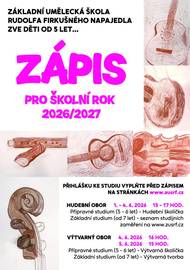 Základní umělecká škola Rudolfa Firkušného Napajedla zve děti od 5 let na Zápis pro školní rok 2026/2027. Hudební obor - zápis se uskuteční 1.-4.6.2026 od 15 - 17 hod, výtvarný obor - zápis se uskuteční 4. a 5.6.2026