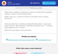 Z důvodu technické chyby zasíláme nový e-mail s informacemi o akcích v našem městě. V původním e-mailu došlo k chybě v uvedených datumech u části uvedených akcí. Přehled kulturních, sportovních a společenských akcí: Knihovna Police nad Metují Vás zve ve čtvrtek 12. 2. od 16 hodin na tvořivé vyrábění tentokrát na téma Valentýnská srdíčka. Knihovna Police nad Metují společně s místní akční skupinou Stolové hory vás zvou na akci Odvaž se, zastav se. Akce probíhá ve dnech 11. 2. a 12. 2.2026 v prostorách Pellyho domů. Ve středu 11. 2. proběhne od 16 hodin vernisáž výstavy fotek na téma Odvaž se, zastav se. V 17 hodin program pokračuje rozmluvou s evangelickým farářem Markem Bártou a následuje od 18:30 muzikoterapie s Pavlínou Prudilovou. Ve čtvrtek 12. 2. startuje ve 14 hodin společná vycházka s Jaroslavem Martinkem, od 15 hodin proběhne komunikační hra s Milenou Machačovou a od 18 hodin následuje debata s hosty na téma Umění se zastavit. Vstup zdarma. Promítání v Kolárově divadle Přijďte si ve čtvrtek 12. 2. od 19 hodin užít premiéru české komedie Když se zhasne. Jedno manželství, které drží pohromadě už jen předmanželská smlouva na ubrousku, čtyři přátelé, sedm hříchů na menu a nespočet vtipných situací, které to s sebou přináší. Hvězdně obsazený film s P. Hřebíčkovou, V. Kotkem, T. Maštalírem, M. Pechlátem a P. Polnišovou. Vstupné 120 Kč. Valentýnský večer s Prima Jazz Bandem proběhne v sobotu 14 2. od 18 hodin na sále PD. Valentýnský večer v Pellyho domech letos nabídne stylovou tančírnu s živou hudbou, kde sál rozezní swingovými rytmy v podání big bandu Prima Jazz Band, který zahraje k tanci i poslechu skladby swingových ér z českého i amerického kontinentu. Valentýnská tančírna je otevřená všem generacím a nevyžaduje taneční zkušenosti – stačí chuť se bavit a nechat se unést hudbou. Vstupné činí 150 Kč v předprodeji a 250 Kč na místě. Od 14. 2. do 15. 3. 2026 bude opět v provozu kluziště s umělou syntetickou plochou. Provozní doba kluziště je ve všední dny od 15 do 18 hodin., o víkendech od 13-18 hodin. V době jarních prázdnin bude kluziště otevřeno každý den od 13 do 18 hodin. Kiosek v provozu. Vstupné 20 Kč za osobu. Na hokej společně Přijďte sledovat zápas českého hokejového olympijského týmu na sál Pellyho domů. Začátek zápasu v neděli 15. 2. ve 12.10. Vstup zdarma, bar otevřen od 11:30. V případě postupu bude naplánováno i další společné sledování zápasů. Lhotský zpívánky a Hostinec u Lidmanů vás zvou v úterý 17. 2. na Vostatkovej maškarní průvod. Průvod půjde přes celou Machovskou Lhotu až do Nouzína. Po cestě bude vyhrávat dechová kapela Broumovanka. Pozor! Letos je začátek již v 15 hodin u mostku na Řejšnej. K dostání budou opět jitrnice a koblihy.