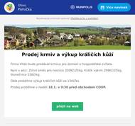 Firma Vítek bude prodávat krmiva pro domácí a hospodářská zvířata. Nyní v akci: Zimní směs pro nosnice 330Kč/25kg, Králík výkrm 299Kč/25kg, Slunečnice 25Kč/kg. Dále proběhne výkup králičích kůží za 15Kč/ks. Prodej proběhne v neděli 18.1. v 9:30 před obchodem COOP.