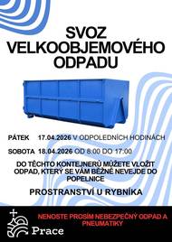 Sběr velkoobjemového odpadu se uskuteční v pátek 17. dubna 2026 odpoledne a v sobotu 18. dubna 2026 od 8:00 do 17:00 na prostranství u rybníka.