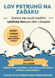 Start v 8:00 h Občerstvení zajištěno – pivo, limo, guláš, pečení pstruzi a jiné dobroty. Úlovek si po zvážení každý rybář odkoupí.