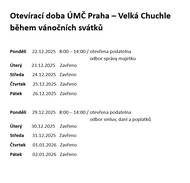 Ordinační hodiny SRPEN Pondělí: 7:30 – 13:00 Úterý: 7:30 – 13:00 Středa: 7:30 – 13:00 Čtvrtek: 7:30 – 13:00 Pátek: 7:30 – 11:00 – pouze objednaní pacienti (v pátek lékařka ordinuje do 10 hod.) Změny v ordinačních hodinách: 1.8. 2025 - MUDr. Knappová DOVOLENÁ, v ordinaci přítomna sestra 13.8. 2025 – MUDr. Knappová ordinuje: 7.30 – 9.30 hod., poté přítomna pouze sestra do 12.00 hod. 14.8. - 22.8. 2025 – MUDr. Knappová DOVOLENÁ, v ordinaci přítomna pouze sestra (Po, Út, St, Čt: 7.30 – 12.00 hod., Pá: 7.30 – 11.00 hod.) 25.8. - 28.8. 2025: DOVOLENÁ 29.8. 2025 - MUDr. Knappová ordinuje: 7.30 – 10:00 hod., nepřítomna sestra Zástup pouze pro akutní stavy: 1.8. + 13.8. - 15.8.: FN Motol – pohotovost, V Úvalu 84, Praha 5, tel: 224 431 111. 18.8. - 22.8.: ošetření pouze akutních stavů - MUDr. Králová, Vrážská 100/12, Praha 5 – Radotín (tel. 257 911 222) – NUTNÉ se předem objednat. - v tomto týdnu přítomna v Chuchli sestra – zajištění receptů, pracovní neschopnosti, odběry krve, apod. 25.8. - 28.8.: ošetření pouze akutních stavů - MUDr. Králová, Praha 5 - Radotí