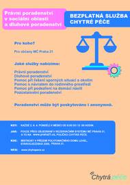Chytrá péče - Právní poradenství v sociální oblasti a dluhové poradenství Chytrá péče v Městské části Praha 21 poskytuje bezplatné právní poradenství v sociální oblasti a dluhové poradenství občanům nacházejícím se v nepříznivé životní situaci. Služba je určena zejména pro seniory, osoby se zdravotním postižením, pečující osoby, samoživitelky a samoživitele, osoby zadlužené nebo v exekuci a všechny, kteří se ocitli v tíživé životní situaci nebo potřebují odbornou radu. Organizace má akreditaci Ministerstva spravedlnosti ČR pro podávání návrhů na oddlužení. Cílem poradenství je pomoci lidem zorientovat se v jejich situaci, najít vhodné řešení a předcházet dalším problémům, včetně podvodného jednání. O poradkyni JUDr. Hana Vyskočilová je zkušená právnička s dlouholetou praxí v oblasti občanského práva. V rámci Ústavu Chytré péče, z. ú. poskytuje odborné, diskrétní a bezplatné poradenství zaměřené na sociálně-právní problematiku, dluhové poradenství, pomoc s oddlužením, podporu osob ve složitých životních situacích. Jejím cílem je pomáhat lidem najít cestu k řešení jejich problémů a posílit jejich právní jistotu. Jaké služby Chytrá péče nabízí: právní poradenství dluhové poradenství pomoc při řešení sporných situací s okolím pomoc s návratem do rodinného prostředí poradenství při podezření na domácí násilí pozůstalostní poradenství Jaké služby nenabízí: Pomoc při založení firmy Poradenství může být poskytnuto i anonymně. Přihlášení, termíny a místo konání: Přihlášení: Pouze přes objednání v online rezervačním systému MČ Praha 21 Termíny: Každé 2. a 4. pondělí v měsíci od 8:00 do 12:00 hod. - první možnost 9. 2. 2026 Místo konání: Místnost v přízemí budovy Level, Staroújezdská 2300, Praha 21 Web: www.chytrapece.cz