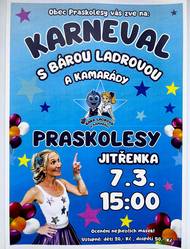 Vážení občané, obec Praskolesy vás i s dětmi zve na karneval. Bude se konat 7. 3. 2026 v 15:00 v KD Jitřenka. Přikládáme plakátek a těšíme se na vás.