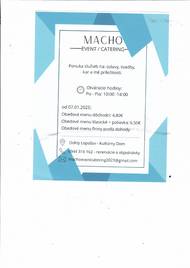 Před 12 dnyPONUKA Obedového menuSpoločnosť MACHO event/catering ponúka: Obedové menu Dôchodci: 4,80 Eur Obedové menu klasické + polievka: 6,50 Eur Obedové menu firmy podľa dohody. Dovoz obedov priamo do Vašej domácnosti. Zverejnenie/poskytnutie jedálneho lístka týždeň vopred. Pre viac informácií volajte na tel. číslo: 0944 316 162 e-mail: machoeventcatering2023@gmail.com