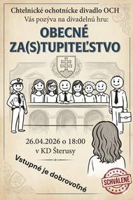 Před 1 měsícemDivadelné predstavenie - Obecné za(s)tupiteľstvoChtelnické ochotnícke divadlo OCH Vás pozýva na divadelné predstavenie Obecné za(s)tupiteľstvo 26.04.2026 o 18:hod. do KD Šterusy
