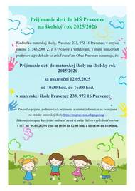 Milí rodičia a budúci škôlkari, zápis detí do materskej školy na školský rok 2025/2026 sa uskutoční 12.05.2025 od 10:30 hod. do 16:00 hod. v materskej škole Pravenec 233, 972 16 Pravenec.