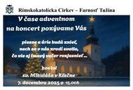 Rímskokatolícka Cirkev – Farnosť Tužina Vás srdečne pozýva na adventný koncert, ktorý sa uskutoční v nedeľu 7.12.2025 o 15:00 h v kostole sv. Mikuláša v Kľačne. V programe sa predstavia študenti žilinského konzervatória pod vedením prof. Mgr. Art. Petra Ripku.