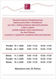 Finanční úřad pro Pardubický kraj, Územní pracoviště v Pardubicích pro Vás v období podávání daňových přiznání k dani z příjmů pořádá výjezdy svých zaměstnanců do obce Přelouč na pomoc s vyplněním a podáním daňových přiznání.