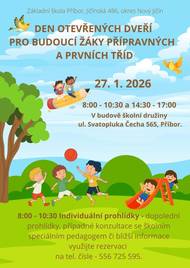 Základní škola Příbor, Jičínská 486, zve rodiče s dětmi na Den otevřených dveří pro budoucí žáky přípravných a prvních tříd. Kdy: 27. ledna 2026 od 8:00-10:30 a od 14:30-17:00 hodin Kde: Budova školní družiny, ul. Svatopluka Čecha 565, Příbor. V dopoledním čase 8:00 - 10:30 hodin jsou možné individuální prohlídky a konzultace se školním speciálním pedagogem. Doporučena je předchozí telefonická domluva na čísle 556 725 595. Žádosti o přijetí do přípravné třídy je možné podat osobně do 15. května 2026 v kanceláři základní školy.