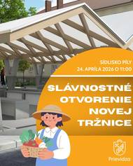 Milí obyvatelia, srdečne vás pozývame na slávnostné otvorenie novej mestskej tržnice, ktorá vznikla kompletnou obnovou pôvodného trhoviska. Vďaka nej získava naše mesto moderný, príjemný a živý priestor pre nákupy, stretnutia aj komunitný život. Termín: piatok 24. apríla Čas: 11:00 hod. Miesto: Mestská tržnica, sídlisko Píly Čo vás čaká: ✅moderné a príjemné prostredie novej tržnice ✅tradičné trhy v novom šate ✅bubnová show ✅vystúpenie Centrum voľného času Prievidza Tešíme sa na vašu účasť!
