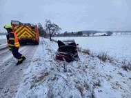 Na zasněžené silnici u Prorub se stala nehoda osobního auta. Řidička byla zraněna a převezena do nemocnice, policie apeluje na opatrnost.