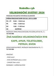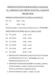 Od 1.12.2025 zahájen prodej živých ryb Po - Pá 13:00 - 17:00 hod So 09:00 - 11:00 hod