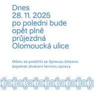 Statutární město Prostějov oznamuje, že dnes (28. 11. 2025) po poledni bude opět plně průjezdná Olomoucká ulice. Úplná uzavírka silnice v místě železničního přejezdu P6542, původně povolená v termínu 18. 11. – 5. 12. 2025, bude díky dohodě města se Správou železnic odstraněna s výrazným předstihem. Číst dál...