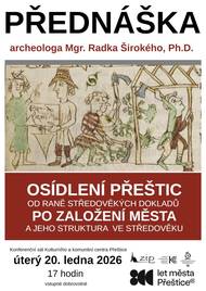 V úterý 20. ledna 2026 se v 17 hodin uskuteční přednáška archeologa Mgr. Radka Širokého, Ph.D., zaměřená na osídlení Přeštic a jeho strukturu ve středověku. Akce se koná v konferenčním sále Kulturního a komunitního centra Přeštice, vstupné je dobrovolné.