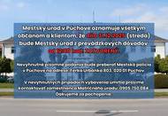 Mestský úrad v Púchove oznamuje všetkým občanom a klientom, že dňa 31.12.2025 (streda) bude Mestský úrad z prevádzkových dôvodov od 12:00 hod. ZATVORENÝ. Nevyhnutné písomné podania bude preberať Mestská polícia v Púchove na adrese: Ferka Urbánka 803, 020 01 Púchov. V nevyhnutných prípadoch vybavenia úmrtia prosíme kontaktovať zamestnanca Matričného úradu: 0905 750 084. Za pochopenie ďakujeme.