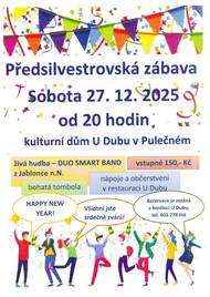 Všichni jste srdečně zváni na předsilvestrovskou zábavu. Kdy: v sobotu 27. 12. 2025 Kde: kulturní dům U Dubu V kolik : od 20. hodin Vstupné: 150 Kč