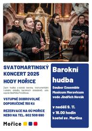 Před 1 měsícemMOŘICKÉ HODY 2025Od 7. do 9. listopadu proběhnou v Mořicích hody. Připraven je následující program: v pátek 7. 11. Hodová zábava Pantock od 20.00 hodin v sokolovně v sobotu 8. 11. Vernisáž výstavy obrazů MŠ, Výstava pokojových květin, Pokřtění nového loga obce 14.00 hodin v knihovně v neděli 9. 11. Hodová mše svatá v 11.00 hodin v kostele sv. Martina, Svatomartinský koncert v 16.00 hodin v kostele