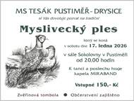 Před 12 dnyMYSLIVECKÝ PLESMS Tesák Pustiměř – Drysice si Vás dovoluje pozvat na tradiční Myslivecký ples, který se koná v sobotu 17. 1. 2026 v sále místní Sokolovny. Začátek je ve 20.00 hodin, k tanci a poslechu zahraje kapela MIRABAND. Vstupné je 150 Kč, zvěřinová tombola a občerstvení jsou zajištěny.