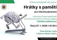 Před 5 dnyHRÁTKY S PAMĚTÍObecní knihovna v Pustiměři pořádá v úterý 27. ledna od 16.30 hod. Hrátky s pamětí pro všechny generace s lektorkou České společnosti pro trénování paměti a mozkový jogging paní Zdeňkou Adlerovou. S sebou si přineste psací potřeby a dobrou náladu.