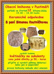 Před 1 měsícemKERAMICKÉ ODPOLEDNE V KNIHOVNĚObecní knihovna v Pustiměři pořádá ve čtvrtek 12. 3. 2026 od 15.30 hod. kvořivé odpoledne s paní Simonou Koutníčkovou, při kterém se budou vyrábět květináčky na sukulenty. Cena jedné dílničky je 50 Kč. Provoz knihovny nebude akcí omezen.