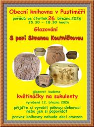 Před 1 měsícemGLAZOVÁNÍ V KNIHOVNĚObecní knihovna v Pustiměři pořádá ve čtvrtek 26. 3. 2026 od 15.30 hod. Glazování s paní Simonou Koutníčkovou, při kterém se budou glazovat květináčky vyrobené 12. 3. 2026. Provoz knihovny nebude akcí omezen.