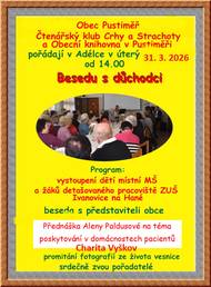 Před 21 dnyBESEDA S DŮCHODCIObec Pustiměř, Čtenářský klub Crhy a Strachoty a Obecní knihovna v Pustiměři pořádají zítra (31. 3. 2026) od 14.00 hodin v Adélce BESEDU S DŮCHODCI. V programu vystoupí děti mateřské a základní umělecké školy, proběhne beseda s představiteli obce, přednáška paní Paldusové z Charity Vyškov, promítání fotografií ze života obce a chybět nebude ani tradiční občerstvení. Na tuto akci Vás srdečně zveme.