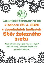 Před 6 dnySBĚR NEPOTŘEBNÉHO ŽELEZASvaz chovatelů Pustiměř provede v sobotu 25. dubna od 8.00 hodin sběr železného odpadu. Železo připravte před své domy, pokud možno, v sobotu ráno. V případě těžkých kusů pomohou chovatelé s odnosem.