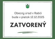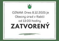 OZNAM: Dnes 8.12.2025 je Obecný úrad v Rabči od 13:00 hodiny zatvorený
