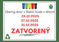 Zberný dvor v Rabči bude v dňoch 22.12.2025, 29.12.2025, 3.1.2026, 5.1.2026 OTVORENÝ. Zberný dvor v Rabči bude v dňoch 24.12.2025, 27.12.2025, 31.12.2025 ZATVORENÝ.