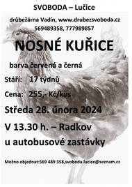 Prodej nosné slepice ve středu 26.2. v 14:05h u obchodu, barva červená a černá. Cena 255,-Kč/ks
