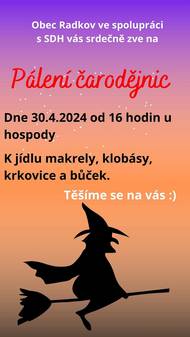 Pálení čarodějnic 30.4.2024 od 16h u hospody. K jídlu makrely, klobásy, krkovice a bůček. Těšíme se na Vás