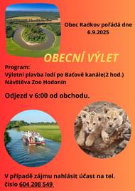 Obec pořádá v sobotu 6.9.2025 výlet spojený s plavbou lodi po Baťově kanále a návštěvou Zoo Hodonín. Odjezd v 6:00h od obchodu. V případě zájmu nahlásit účast na tel. čísle 604208549.