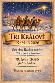 Tři malí koledníci budou dne 6.1.2024 v odpoledních hodinách procházet naší obcí a vybírat do kasičky