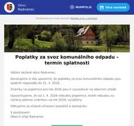Vážení občané obce Radvanec, dovolujeme si Vás upozornit, že poplatky za svoz komunálního odpadu jsou splatné nejpozději do 31. 3. 2026. Známky na popelnice pro rok 2026 jsou k vyzvednutí na obecním úřadě. Upozorňujeme, že od 1. 4. 2026 nebudou popelnice, které nebudou označeny platnou známkou na rok 2026, vyváženy. Děkujeme za včasné uhrazení poplatků a spolupráci. S pozdravemObecní úřad Radvanec