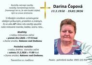 Dňa 19.2.2026 nás vo veku 67 rokov opustila pani Darina Čopová. Modlenie za zosnulú bude v piatok 20.2. o 17.15, posledná rozlúčka bude v sobotu 21.2.2026 o 11.00 hod. v Dome smútku. Príbuzným vyjadrujeme úprimnú sústrasť.