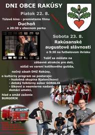 Obec Rakúsy srdečne pozýva všetkých občanov a návštevníkov na Dni obce Rakúsy, ktoré sa uskutočnia 22. a 23. augusta 2025. Čaká vás bohatý program plný zábavy, kultúry, súťaží a chutného jedla. V piatok si vychutnáme letné kino pod holým nebom, v sobotu sa stretneme na augustových slávnostiach.