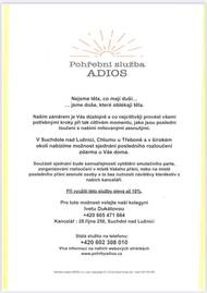 Pohřební služba ADIOS poskytuje citlivé a důstojné rozloučení s našimi milovanými zesnulými. ADIOS nabízí bezplatné sjednání rozloučení přímo u Vás doma či dle přání zesnulého.