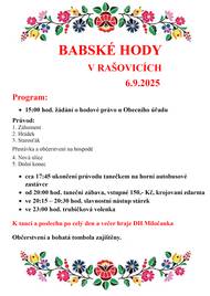 Zahrádkáři z Rašovic Vás zvou na tradiční Dožatou v pátek 3.10. 2025 od 16 hodin. Posezení v cukrárně Výstava prací žáků a dětí rašovské školy. Tombola a tvořivé dílny pro děti. Možnost zakoupení kateřinek, macešek aj., burčáku, medu a chutných zákusků, kávy, čaje aj.