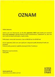 Miestna pošta bude dňa 19.11.2025 z prevádzkových dôvodov otvorená v čase od 13:30-17:00
