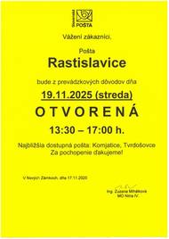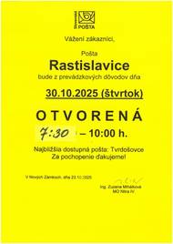 Dňa 30.10.2025 bude pošta v Rastislaviciach z prevádzkových dôvodov otvorená od 7:30 do 10:00