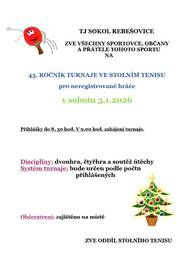 TJ Sokol Rebešovice oddíl stolního tenisu zve všechny sportovce, občany a přátele tohoto sportu v sobotu 3. ledna 2026 na turnaj. Přihlášky do 8.30 hod., zahájení turnaje v 9.00 hod. Disciplíny: dvouhra, čtyřhra a soutěž útěchy. Občerstvení zajištěno na místě.