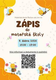Před 2 měsíciZápis do 1. třídyZákladní škola a Mateřská škola Řečice zve budoucí prvňáčky a jejich rodiče k Zápisu do 1. třídy pro školní rok 2026/2027. Zápis se bude konat ve středu 11. února od 14 do 17 hodin. Podrobné informace a dokumenty najdete pod odkazem nebo kódem na plakátku. (Můžete však přijít i bez nich.) Kritériem pro přijetí dítěte je dosažení šestého roku věku před 1. zářím 2026.