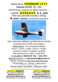 Před 6 dnyPosezení s knihou, pošta, víno Zajíček, vyhlídkové lety1) Mexické ženy všechny srdečně zvou na Posezení s knihou. Sejdeme se v šenku kulturního domu zítra v 17 hodin. Představíme vám některé zajímavé knihy, poslechnete si z některých ukázky. Vezměte si s sebou i knihu, která vás v poslední době zaujala. 2) Z důvodu plánované odstávky elektrické energie bude pošta v Radešínské Svratce zítra otevřena od 7 do 11.15 hodin. 3) Ve středu 15. dubna přijede do naší obce prodejce Víno Zajíček z Podpálaví. Bude prodávat sudová vína od 75 Kč/litr a výběrová lahvová vína. Nabízí 10 druhů, například Pálava, Aurelius, Chardonnay a další. K prodeji je i domácí višňovice. Prodejce se zdrží u KD od 11.50 hodin asi půl hodiny. 4) Vyhlídkové lety Cessnou 172 FR z letiště v Bobrové – více informací níže