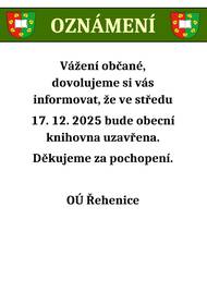 Rehenice: Vazeni obcane, dovolujeme si vas informovat, ze dnes 17. 12. bude obecni knihovna uzavrena. Dekujeme za pochopeni. OU Rehenice