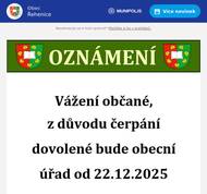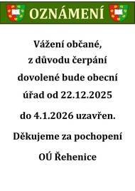 Rehenice: Vazeni obcane, z duvodu cerpani dovolene bude obecni urad od 22.12.2025 do 4.1.2026 uzavren. Dekujeme za pochopeni OU Rehenice